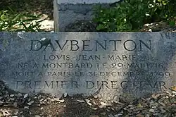 Daubenton published many articles in the memoirs of the Parisian Académie Royale des Sciences, presenting his research on animals, the comparative anatomy of extant and fossil animals, vegetable physiology, mineralogy, agriculture, and the merino sheep that he successfully introduced into France. He was elected as a member to the American Philosophical Society in 1775.[2] From 1775 onwards, Daubenton lectured on natural history in the College of Medicine, and in 1783 on rural economy at the Alfort school. He was also professor of mineralogy at the Jardin du Roi. As a lecturer he was in high repute, and to the last retained his popularity. In December 1799 he was appointed a member of the senate, but at the first meeting which he attended he fell from his seat in an apoplectic fit and, after a short illness, died at Paris. He was married but the couple had no children.[3] His wife, Marguerite Daubenton (1720-1818), was a novelist and the author of Zelie dans le Desert (1786).