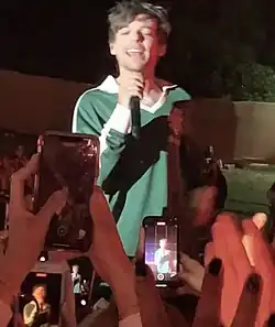Tomlinson's second world tour, Faith in the Future World Tour, commenced in North America in May 2023.[122] Asian concert dates in mid to late April were originally announced;[123] however, in early April it was announced that they were cancelled, citing "unforeseen circumstances".[124] He performed in North America and Europe in 2023 and Asia, Australia and Latin America in 2024.[125][126][123] In November 2023, shortly after performing in The O2 Arena,[127] Tomlinson was nominated for the Live Act Award at the Rolling Stone UK Awards.[128]