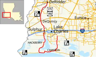 The route travels in a mirror-image of the letter "J" as it loops through the wetlands surrounding Calcasieu Lake and passes through Cameron, a small community situated on the Gulf of Mexico. It then extends northward through Sulphur en route to its terminus in DeRidder.