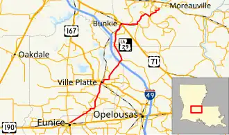 | Bunkie | 39.281 | 63.217 | South end of US 71 concurrency | ||