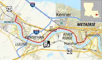 Louisiana Highway 48 (LA 48) is a state highway in Louisiana that serves St. Charles and Jefferson Parishes. It runs from west to east, parallel to the east bank of the Mississippi River, from Norco to Jefferson. It spans a total of 20.9 miles (33.6 km).[1] Throughout its run, LA 48 is known as Apple Street, River Road, 3rd Street, Reverend Richard Wilson Drive, and Jefferson Highway.