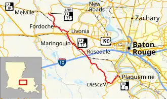 LA 77 begins at LA 1 near The Island Country Club in Plaquemine and runs parallel with Bayou Jacob as it heads west. Leaving Plaquemine, the highway then runs parallel with LA 3066 and Bayou Plaquemine heading through Crescent. Meeting Port Allen Lock, it crosses over the Bayou Grosse Tête Draw Bridge before heading north. It then runs parallel with Port Allen Lock and then heads northwest, intersecting with LA 386 before heading into Grosse Tête. The highway then interchanges with I-10 at exit 139 before entering Rosedale and intersecting LA 76. LA 77 then runs parallel with LA 411 heading into Maringouin. It then intersects LA 977 and runs through downtown before meeting LA 76 again before heading north. The highway then enters Valverda and intersects LA 977 before running parallel with LA 411 and Port Allen Lock. It then intersects LA 81 and US 190 before passing through Livonia. The highway then turns to the west and passes through Fordoche and intersects LA 81 again before turning to the north. LA 77 then meets its northern terminus at LA 10 and the road continues north assigned as LA 10.