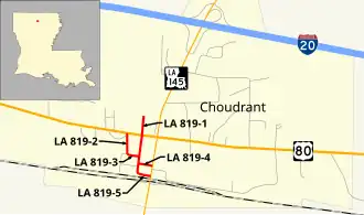 Louisiana Highway 819 (LA 819) is a collection of five state-maintained streets located in the Lincoln Parish village of Choudrant that have a total length of 0.58 miles (0.93 km).[1] All five routes were established in the 1955 Louisiana Highway renumbering[2] and are presently unsigned.