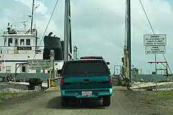 The first improvements were made to the aforementioned section through Cameron, which is called by its original name of Leesburg in the official route description.[19] It consisted of metalling (gravel surfacing) the southern portion of State Route 104, a federal aid route which provided the parish seat with its first highway connection to what was essentially the mainland. Route 104 followed what is now the western leg of LA 27 south from Sulphur in neighboring Calcasieu Parish and around the west side of Calcasieu and Mud Lakes to the gulf coast at Holly Beach. It then turned east to Cameron, running concurrent with the future Route 292. This work was completed by 1930.[15][20] Then, as now, a ferry service provided the necessary crossing at Calcasieu Pass.[21]