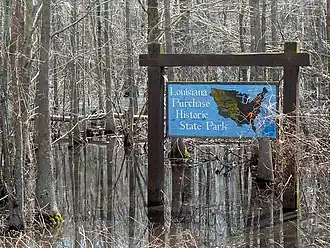 The Louisiana Purchase State Park is located at the eastern end of Highway 362, southeast of Blackton, Arkansas, at the tripoint junction of Lee, Monroe, and Phillips counties. It is a 37.5-acre (15.2 ha) parcel of swamp, or forested wetlands, which is remarkably unchanged from the time when surveyors came here on November 10, 1815. This type of wetlands is becoming increasingly rare because of the practice of draining and clearing such land for agricultural use. The boardwalk, 950 feet (290 m) long, leads to the site of the marker, with occasional interpretive signs describing the ecology of the area and the significance of the landmark.[2]