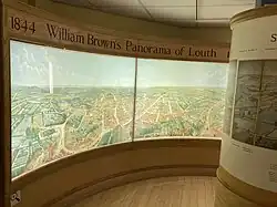 Galleries at the museum cover 200,000 years of local archaeology and history, including fossils, the disastrous Louth Flood of 1920 and the story of the Ghost of the Green Lady of Thorpe Hall. The museum's Panorama Gallery displays two back-lit copies of William Brown's Panorama of Louth as viewed from the top of St James' spire in 1844. Brown's original panoramic paintings from which the display is formed were painted between 1844 and 1847 and today the two paintings hang together in Louth Town Hall. Brown's detailed artwork reveals the people, businesses and buildings of Louth as it was in 1844, and shows the landscape as far as the North Sea to the east and northwards to the Humber Estuary and beyond.[1]
