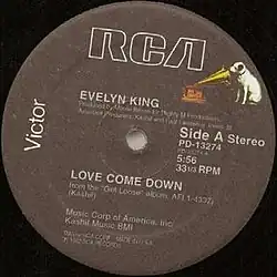 "Love Come Down" is a song written by American musician Kashif. It was recorded by American singer Evelyn King for her fifth album, Get Loose (1982). "Love Come Down" was released in July 1982 by RCA Records as the lead single from Get Loose. In the United States, it reached number one on the Billboard Black Singles and Hot Dance/Disco charts and number 17 on the Billboard Hot 100. It also cracked the top 20 on the charts in several other countries, including number seven in the United Kingdom.