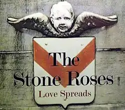 John Squire designed the "Love Spreads" cover, using a photograph of one of the four stone cherubs on the Newport Bridge in Newport, South Wales.[4] The cherubs on the bridge are modelled after Newport's coat of arms, which contains a cherub with winged sea lions. The cherub design was subsequently used on many pieces of Second Coming merchandise.