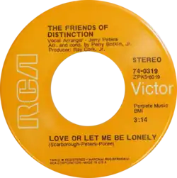 "Love or Let Me Be Lonely" is a pop song recorded by the soul group The Friends of Distinction and released as a single in early 1970. The song was a multi-format success, peaking at #6 on the Billboard Hot 100 on May 1, 1970.[2] It also reached #13 on the R&B chart,[3] and #9 on the Adult Contemporary singles chart.[4] The song is ranked as No. 63 on the Hot 100 singles of 1970.[5]