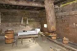For lighting, luchina is inserted in a crack in the wooden wall or in a special holder called svetets.[1] A small metal svetets may be stuck in a wooden wall. A more elaborate svetets may be manufactured with a stand. A small basin with water is usually placed under the svetets, to collect ashes and coals.