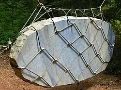 One of Fabro's first pieces was called Tubo da mettere tra i fiori (Tube to place among flowers), 1963. It was a site-specific installation designed for a Milanese garden, even if it was never displayed there; it was made of telescopic steel tubes.[5] He made several works that deal with steel tubes in dialogue with basic physical laws of nature.[6] In 1965 he had his first solo show, at the Galleria Vismara, in Milan, where he combined mirror pieces with spatial lines.[7] Around 1966, he began to make performative works such as Indumenti: posaseni, calzari, bandoliera (Garments: bra, boots, cross-belt), 1966; Allestimento Teatrale (Cube di specchi) Theatrical Staging (Cube of Mirrors), 1967-1975; and Pavimento/Tautologia (Floor/ Tautology), 1967.[6]