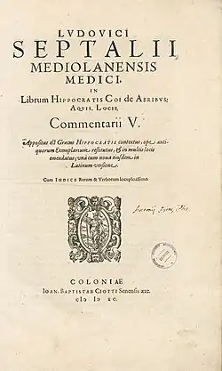 - Settala, Ludovico (1590). In Librum Hippocratis Coi de aeribus, aquis, locis Commentarii V. appositus est graecus Hippocratis contextus ... restitutus et ... emendatus, una cum nova eiusdem in Latinum versione (in Latin). Colonia: Giovanni Battista Ciotti. Retrieved 3 March 2019.