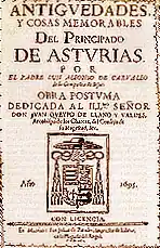 Cover of a 1695 print of "History of the Antiquity and memorable things of the Principality of Asturias"