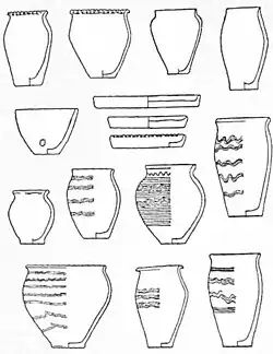 The cultural phases are divided into "Early" with prevalent stucco ceramics (late 7-8th century), "Middle" or "Developed" with partially wheel-made pottery (earliest since 761,[12] but usually 9th century), and "Late" with predominant wheel pottery (10th century).[1][3] Generally, the ceramic is predominantly of conic pots with enlarged upper part and bent rim, also bowls and frying pans.[1][2][3] The pottery has ornamental lines, bands, rims and holes.[13]