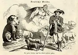 A 1867 German caricature showing Germania, the personification of the German nation, asking Otto von Bismarck (as a shepherd of the German states), to protect Luxembourg, who is threatened by Napoleon III (as a wolf) on the other side of the Rhine
