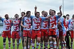 The Rugby Club Luxembourg was founded in May 1973 by a group of expatriates working in the Grand Duchy. Several of the founders still live in Luxembourg and contribute one way or another to the sport. The club played its first competitive game against US Castillionnaise in September 1973. Up until 1995, the club played in the Alsace-Lorraine regional league. In that year, the team joined the Belgian second division, which it belonged to until 1998, when it earned promotion to the first division. In 2001, the club decided to return to the French league system, again playing regionally in Alsace-Lorraine. It won its division in 2008 but, after an invitation to play in Germany, decided to join the German league system in 2009. In the 2017–2018 season, RCL is leading Bundesliga 2 West unbeaten and hopes to secure promotion to Bundesliga 1 for the 2018–2019 season.