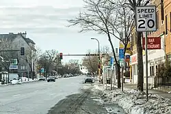 North of Interstate 35W / Minnesota State Highway 62, Lyndale Avenue enters Minneapolis and the street soon becomes a one-way to connect with Minnesota State Highway 121, a freeway spur connecting to I-35W. After their intersection with 56th Street West, the road again becomes a two- to three-lane roadway across Minnehaha Creek and north toward Uptown. Near the intersection with Lake Street, it becomes a three-lane as a major commercial street which remains continuous until the Virginia Triangle (the commons with Hennepin Avenue and Interstate 94).[1] After the Triangle, Lyndale Avenue splits, with matching one-way streets on either side of Interstate 94 functioning as frontage roads. They join at Plymouth Avenue. The road remains three lanes until just north of Broadway, where it becomes a two-lane road. At 49th Avenue North, the road again diverges into matching one-way streets on either side of I-94. At 53rd Avenue North, it becomes a local street for several blocks until ending at 57th Avenue North in Brooklyn Center.