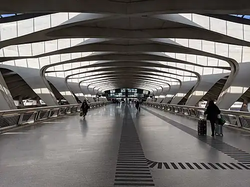 Saint-Exupéry station was designed by Santiago Calatrava, cost 750 million Francs and opened on 3 July 1994, at the same time as the high-speed line to Saint-Marcel-lès-Valence. The building is mostly a combination of concrete and steel. The station has six tracks laid in a cutting. The two central tracks are isolated to permit trains to traverse the station at full speed (300 km/h) and have no platforms. The two external sets of tracks have 500 m long platforms. A small piece of land to the west is put aside for future expansion. Above the tracks, a 300 m long passenger concourse gives easy access to the platforms and is equipped with several travelators.
