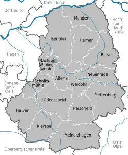 The Märkischer Kreis (German pronunciation: [ˌmɛʁkɪʃɐ ˈkʁaɪs], lit. 'Markian District') is a district (Kreis) in central North Rhine-Westphalia, Germany. Neighbouring districts are Unna, Soest, Hochsauerland, Olpe, Oberbergischer Kreis, Ennepe-Ruhr, and the city of Hagen.