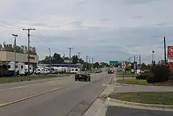 M-52 starts at the Ohio state line as Adrian Highway in Fairfield Township, Lenawee County, where it is the continuation of SR 109 into Michigan. The highway runs north to Adrian where it intersects US Highway 223 (US 223) at the city border with Madison Township.[1] As the highway crosses the city line, it is concurrently designated Business US 223 (Bus. US 223) along Main Street into downtown Adrian. Bus. US 223/M-52 intersects Beecher Street, which carries M-34 to the latter's eastern terminus in Adrian. After Beecher, Main Street turns north-northeast into the downtown area.[3]