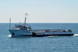 MV Katama is a freight ferry boat operated by the Steamship Authority. The ship is named after the Katama region of Martha's Vineyard. The ship was built by Scully Bros Boat Builders at their Morgan City, Louisiana yard, completed in 1982, and initially named Pro Navigator[3] before being acquired by the Steamship Authority in 1986. She is 215.8 feet (65.8 m) long, 52 feet (16 m) wide and has a speed of 13.5 knots (25.0 km/h). She was designed by Guarino & Cox as a platform supply vessel and is a sister ship to MV Gay Head.