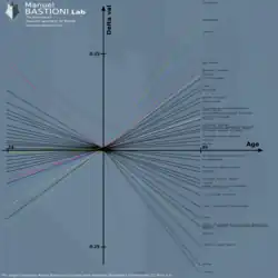 The graph of non-linear functions used in the algo of age metaparameter. The vertical axis represents the delta value to add to the average character. The horizontal axis represents the age from 18 to 80 years old.