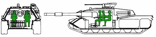 46 152 mm rounds could be carried on the models with Rheinmetall autoloaders. The MBT-70 with the GM autoloader could carry 48 rounds,[14] and the XM803 could carry 50 rounds.[15] The MBT-70 with the Rheinmetall loader carried 26 rounds in the autoloader. Twenty more rounds were carried in two compartments including eight rounds stowed on the rear hull bulkhead and twelve behind the driver's capsule.[16]