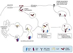 12. ^ a b c d e f g Mellins ED, Stern LJ (February 2014). "HLA-DM and HLA-DO, key regulators of MHC-II processing and presentation". Current Opinion in Immunology. 26: 115–22. doi:10.1016/j.coi.2013.11.005. PMC 3944065. PMID 24463216.