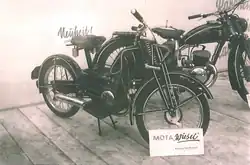 Mota Maschinenbau GmbH developed a two-wheel-vehicle between 1948 and 1952 which should unite the advantages of a scooter and motorbike: The Wiesel had leg shields and a carrier on the backside.[4] The engines were produced by the company itself in different variations: 50, 75 and 98 cm3 of cubic capacity. Often the saddle wasn't height-adjustable, but adjustable to the front or back. A toolbox was installed just behind of it. The Wiesel was produced with the following high-quality components: