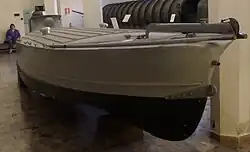 The explosive motorboat MT (Motoscafo da Turismo) also known as barchino (Italian for "little boat"), was a series of small explosive motor boats developed by the Italian Royal Navy, which was based on its predecessors, the prototype boat MA (Motoscafo d'Assalto) and the MAT (Motoscafo Avio Trasportato), an airborne prototype. Explosive motorboats were designed to make a silent approach to a moored warship, set a collision course and run into full gear until the last 200 or 100 yards to the target, when the pilot would eject after locking the rudder. At impact, the hull would be broken amidships by a small explosive charge, sinking the boat and the warhead, which was fitted with a water-pressure fuse set to go off at a depth of one metre.[1]