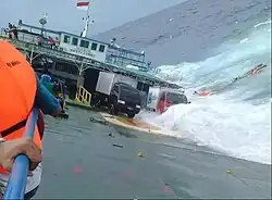 In response to the threat of a possible capsizing, the captain decided to change the ferry's heading and beached the ferry onto the seabed, to aid the rescue efforts.[10] At 13:40 local time, the ferry contacted the seabed approximately 300 metres (980 ft) off Pabadilang Beach. Passengers were immediately told to don life-jackets. A video showed that the ferry was listing severely during the evacuation. Multiple people jumped into the sea and tried to swim to the shore, while others were thrown from their life-rafts due to the rough waves. Vehicles on board the ferry fell and were swept away.[5]