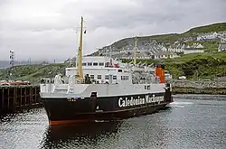 She was troubled by a run of early breakdowns: starboard ramp, hoist, forward capstan, bow-thrust unit and automatic steering. All were duly fixed, but her gearboxes continued to be a regular problem throughout her career.[1] The absence of a turntable at the forward end of her car deck made the management of on-board traffic difficult. Initial problems were exacerbated by the need to use a side-loading hoist. Things improved after she hanselled the new end-loading linkspan at Gourock on 26 July 1971.