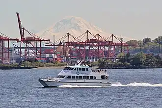 The Rachel Marie in Eliott Bay on the Downtown Seattle-West Seattle route with Mount Rainier in the background in May 2013.