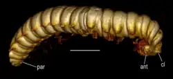 - ^ a b c Riquelme, F.; Alvarado-Ortega, J.; Ramos-Arias, M.; Hernández, M.; Dez, I.; Lee-Whiting, T. A.; Ruvalcaba-Sil, J. L. (2013). "A fossil stemmiulid millipede (Diplopoda: Stemmiulida) from the Miocene amber of Simojovel, Chiapas, México". Historical Biology. 26 (4): 1–13. doi:10.1080/08912963.2013.778843. S2CID 85299484.