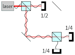 It is interesting to consider what would happen if the photon were definitely in either the "lower" or "upper" paths between the beam splitters. This can be accomplished by blocking one of the paths, or equivalently by removing the first beam splitter (and feeding the photon from the left or the bottom, as desired). In both cases there will no longer be interference between the paths, and the probabilities are given by , independently of the phase . From this we can conclude that the photon does not take one path or another after the first beam splitter, but rather that it must be described by a genuine quantum superposition of the two paths.[7]