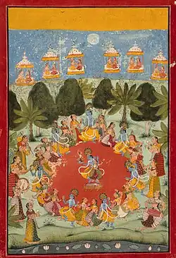 Madanamohana (Sanskrit: मदनमोहन, romanizedMadanamohana) is an epithet of the Hindu deity Krishna.[1] It translates as, "he whose charm (mohana) bewilders even the god of love (madana)". The epithet describes the powerful nature of the attraction for the deity from his devotees, exemplified by the legend of the rasalila, where the gopis (cowherdesses) of the region Vraja abandon all their obligations to answer the call of Krishna.[2] The epithet is also identified with the form of the deity worshipped by Sanatana Goswami of the Gaudiya tradition at Vrindavan.[3][4]