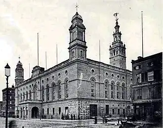 The new building, which replaced an antiquated open-air structure that was previously a railroad passenger depot, was built by a syndicate which included J. P. Morgan, Andrew Carnegie, P. T. Barnum,[2] Darius Mills, James Stillman and W. W. Astor. White gave them a Beaux-Arts structure with a Moorish feel, including a minaret-like tower modeled after Giralda, the bell tower of the Cathedral of Seville[2] – soaring 32 stories – the city's second tallest building at the time – dominating Madison Square Park. It was 200 feet (61 m) by 485 feet (148 m), and the main hall, which was the largest in the world, measured 200 feet (61 m) by 350 feet (110 m), with permanent seating for 8,000 people and floor space for thousands more. It had a 1200-seat theatre, a concert hall with a capacity of 1500, the largest restaurant in the city and a roof garden cabaret.[3] The final cost for the building, which the New York Times called "one of the great institutions of the town, to be mentioned along with Central Park and the bridge of Brooklyn" was $3 million.[3]