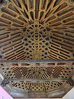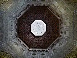 The layout of the building was originally organized around a pool in the center.[26] Most madrasas shared this layout and typically had rooms for students arranged around the courtyard.[8][13] On the southeast side of the Nasrid madrasa's courtyard was a prayer room, which today is the only part of the original building that has been preserved and restored.[8] The room, accessed via a decorated horseshoe arch doorway, is square and measures 6.84 metres per side. It has a high ceiling and roughly half-way up the walls the room transitions from a square to an octagonal shape. The transition from square to octagon is achieved at the corners of the room via four muqarnas-sculpted squinches. The rest of the walls, especially the upper walls, are covered in intricate stucco decoration with arabesque and calligraphic motifs. The upper walls are also pierced with 16 windows. At the top of the walls is a muqarnas cornice which precedes the wooden cupola ceiling.[14][8][3]