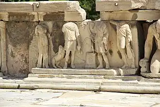 Icarius was a follower of the wine god Dionysus and had been taught how to make wine. While travelling, Icarius met some shepherds and gave them wine; they became intoxicated and believed Icarius had poisoned them, so they killed him. Erigone was worried about her father, and set off with Maera to find him. Maera led her to his grave, and both became so overwhelmed with grief that she hung herself and Maera leapt off a cliff. Upon hearing the news, Dionysus was angry and punished Athens with a plague, inflicting insanity on all the unmarried women, who all hung themselves, imitating Erigone. The plague did not cease until the Athenians introduced honorific rites for Icarius and Erigone. Zeus or Dionysus placed Icarius, Erigone and Maera in the sky as the constellations Virgo (Erigone) Boötes (Icarius), and the star Procyon (Maera).[1][2][3]