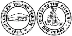 One of the rights claimed by Coffin was the right to coin money, and he ordered the minting of pennies by Edward Thomason of Birmingham, from a design possibly made by the engraver Thomas Halliday, who is known to have worked with Thomason at this time.[6] The obverse of the coin depicts a seal on an ice floe. It is inscribed 'MAGDALEN ISLAND TOKEN' with date '1815' appearing at the bottom. The reverse of the coin depicts a filleted cod and its inscription says 'SUCCESS TO THE FISHERY', followed by the denomination of 'ONE PENNY'. The cod and the inscription on the reverse refers to the fishing industry that was essential to the islands' economy.
