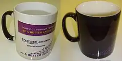 A magic mug, also known as a heat changing mug, transforming mug, or disappearing mug is a mug that changes color when it is filled with a hot liquid. This effect is created by using thermochromic ink.