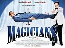 Magicians is a 2007 British comedy film released on 18 May 2007.[1] It stars comic duo Robert Webb and David Mitchell as stage magicians Karl and Harry. The two magicians compete together in a magic competition, despite their personal differences. The film is directed by Andrew O'Connor and written by Jesse Armstrong and Sam Bain, who are also the writers of the Channel 4 sitcom Peep Show, which stars Mitchell and Webb. Other principal cast members include Jessica Hynes, Darren Boyd, Steve Edge, Peter Capaldi,[1] and Andrea Riseborough.[2]