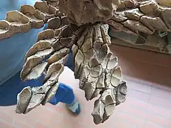 They are trees reaching up to 35 m height and 100 cm in diameter. Leaves alternate, simple, spirally arranged, coriaceous, elliptic, measuring from 11 to 26 cm long and from 7,4 to 12 cm wide; petiole greatly thickened at the base and present a scar that cover it completely. Flowers have cream color, two bracts up to 5 cm long covering the flower bud; three sepals and seven petals. The fruits are subglobose to ovoid, large, up to 16 cm long; 1-2 seeds per carpel with red cover.[1][2]