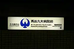 The station's name, which is the longest for a Japan subway station, means "Front of Kyushu University Hospital in Maidashi". Chiyo-Kenchōguchi Station is, however, closer to the hospital. Maidashi-kyūdai byōin mae is the station closest to the Prefectural Government office. The symbol on the sign is a dove, representing peace and nursing (a reference to the nearby hospital).