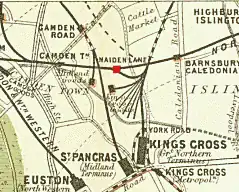 This Maiden Lane station – 51°32′27″N 0°07′37″W / 51.540917°N 0.127051°W / 51.540917; -0.127051 –- was a short distance northwest of the Great Northern Railway station and near the present High Speed 1 tunnel portal. It also served King's Cross Goods Yard. It closed in 1916 [2] or 1917,[3] after the LNWR in 1916 electrified the southern pair of the four tracks for passenger services, leaving the northern pair, on which the station was built, solely for steam-hauled goods traffic.