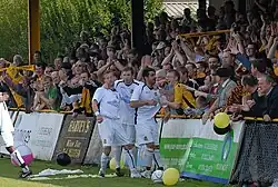 After winning the Isthmian League Premier Division, Maidstone United were promoted to the National League South (formerly the Conference South). In the 2015–16 season the team again qualified for the first round proper of the FA Cup where they narrowly lost 1–0 at home to League Two side Yeovil Town in front of a record-breaking crowd of 2,811.[34] On 14 May 2016, Maidstone United were promoted to the National League after defeating Ebbsfleet United in the National League South promotion final at Stonebridge Road. The match finished 2–2 after extra time, and Maidstone won 4–3 in the resulting penalty shoot-out.[35]