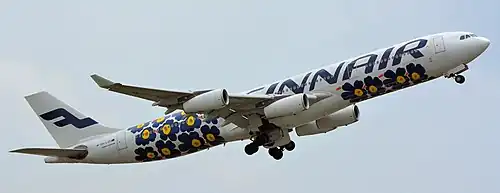 Since 2012, Finland's airline Finnair has been flying an Airbus A340-300 to its Asia destinations sporting a blue Unikko print, while an Airbus A330 painted in an Anniversary Unikko has been serving its other intercontinental routes.[44]