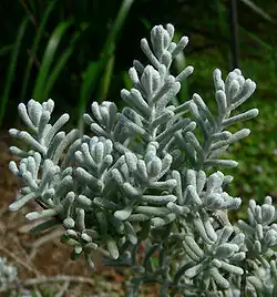 Maireana sedifolia, also known as the bluebush or pearl bluebrush is a compact shrub endemic to Australia, and found in New South Wales, Victoria, South Australia, Western Australia, and the Northern Territory.[4] It is used in pasture and as a garden plant where it is popular due to its distinctive grey foliage.