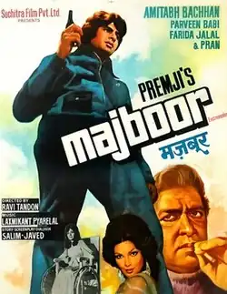 Majboor (transl.Compelled) is a 1974 Indian Hindi-language action thriller film directed by Ravi Tandon. Written by Salim-Javed, the film is loosely inspired by two 1970 American films – Zig Zag and Cold Sweat. It stars an ensemble cast of Amitabh Bachchan, Parveen Babi, Pran, Farida Jalal, Sulochana Latkar, D. K. Sapru, Iftekhar, Satyen Kappu and Rehman.
