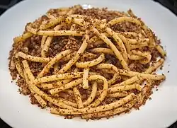 Makarony po-flotski (Russian: макароны по-флотски; lit.'navy-style macaroni') is a Russian dish made of cooked pasta (typically macaroni, hence the name) mixed with stuffing made of stewed or fried ground meat (usually beef or pork) and fried onions, usually salted and optionally peppered.[1][2] Originally served in maritime forces, the dish became popular in Russia due to its simplicity, low cost and short time of preparation. Makarony po-flotski became especially popular after World War II during times of poverty in the Soviet Union.[2] The ground meat can be replaced with canned meat (tushonka).